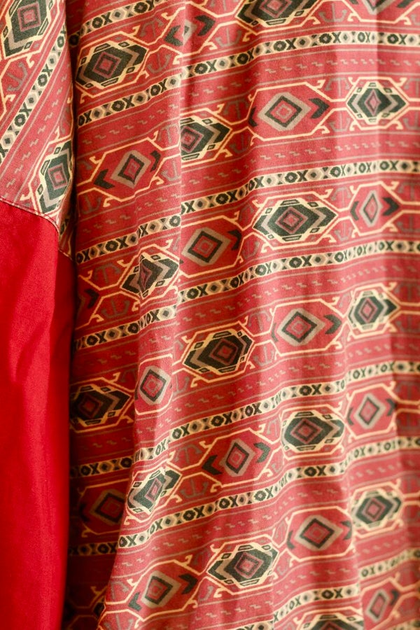 Deze vintage lentejas heeft een uniek Aztec-geïnspireerd patroon in warme rode tinten, gecombineerd met effen rode mouwen en elastische boorden. De jas heeft een opstaande kraag en een rits aan de voorkant. Op de borst zit een subtiel geborduurd logo.