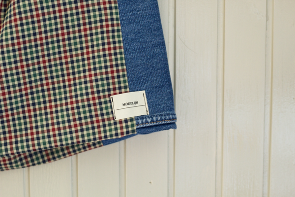 Deze upcycled Levi’s denim rok is een waar Modelijn-kunstwerk: stoer denim gecombineerd met een speels patchwork van geruite vintage stoffen in diepe tinten groen, rood en navy. Wat ooit een klassieke Levi’s jeans was, kreeg in het atelier een volledig nieuw leven als een uniek, handgemaakt statement piece.