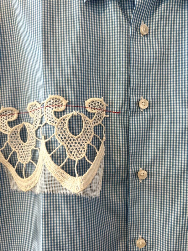 Dit upcycled blauwe overhemd met kanten details is een opvallend en tegelijkertijd poëtisch ontwerp.