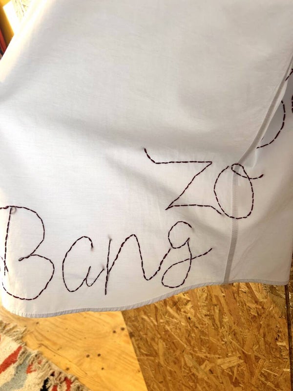 Deze blouse is gemaakt van een bestaand wit overhemd. De originele knoopsluiting, kraag en manchetten zijn behouden. Op de borst is een extra detail toegevoegd en aan de voorkant is tekst geborduurd.
